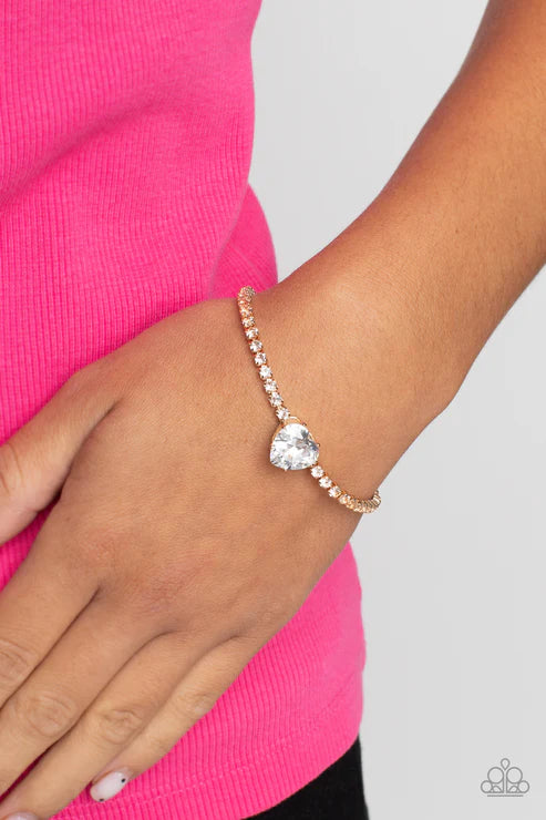 An oversized white heart-shaped gem, set in an airy, pronged gold fitting, glitters at the center of a blinding row of dainty, glassy white rhinestones set in square gold fittings, resulting in a flirtatious sparkle around the wrist. Features an adjustable clasp closure.