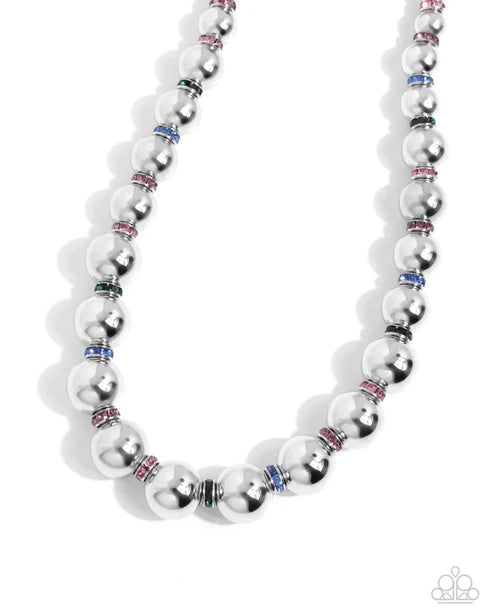 Infused along an invisible string, a collection of glossy silver beads gradually increases in size, alternating with multicolored rhinestone-infused silver discs, for a pop of fun-loving color below the neckline. Features an adjustable clasp closure.