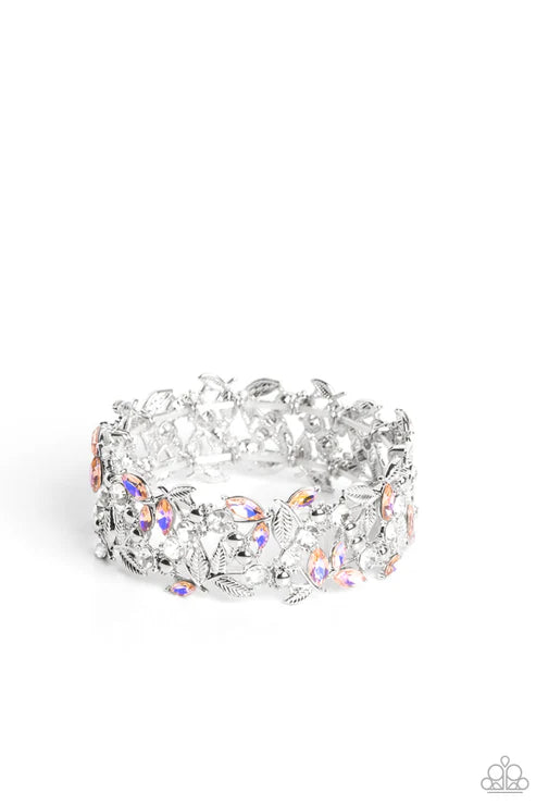 Round white gems and marquise-cut iridescent orange gems intertwine around polished silver studs and ornate feather-like details in a glitzy pattern. The textured, glittery display is threaded along elastic stretchy bands for a whimsical finish. Due to its prismatic palette, color may vary.