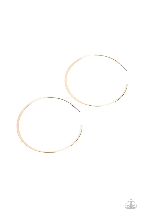 Featuring a high-sheen, a slightly flared, thin smooth gold bar curves into an oversized hoop resulting in a basic staple piece. Earring attaches to a standard post fitting. Hoop measures approximately 2 1/2" in diameter.