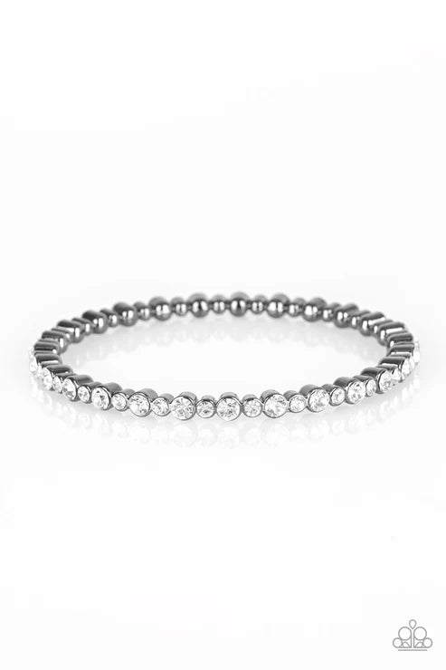 A glistening gunmetal bangle is encrusted in countless white rhinestones for a timeless look.