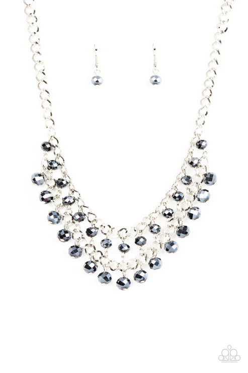 Featuring metallic iridescence, two rows of flashy blue crystal-like beads cascade from the bottom of two interlocking silver chains, resulting in a radiant fringe below the collar. Features an adjustable clasp closure.