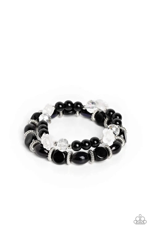 Silver studded rings, varying shapes of black beads, silver accents, faceted clear beads, and white resin roses stretch across elastic stretchy bands around the wrist for a refined, floral display.